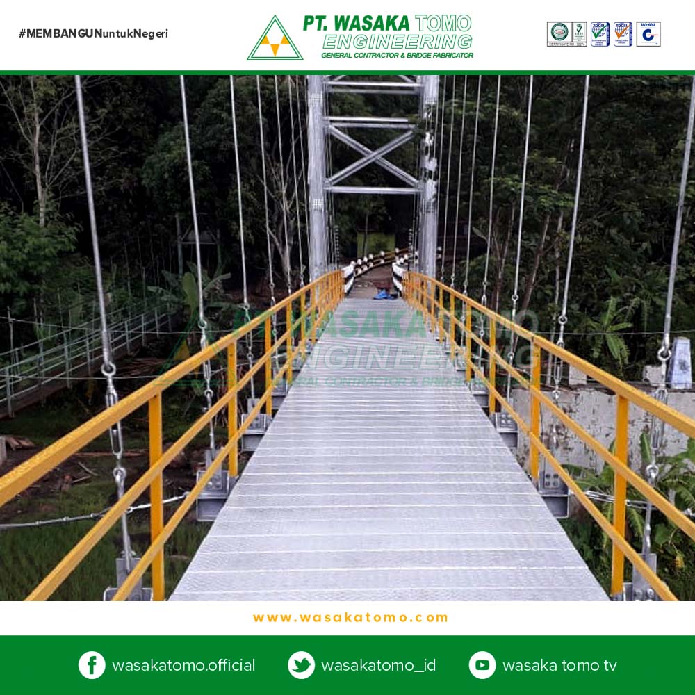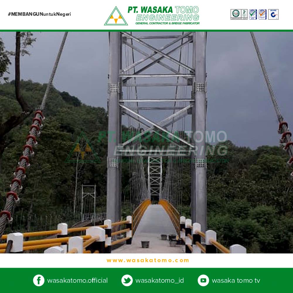 Jembatan gantung adalah jembatan yang berfungsi sebagai pemikul langsung beban lalu lintas yang melewati jembatan tersebut, terdiri dari lantai jembatan, gelagar pengaku, batang penggantung, kabel pemikul dan pagar pengaman. Seluruh beban lalu lintas dan gaya-gaya yang bekerja dipikul oleh sepasang kabel pemikul yang menumpu di atas 2 pasang menara dan 2 pasang blok angkur Surat Edaran Menteri PU, 2010.